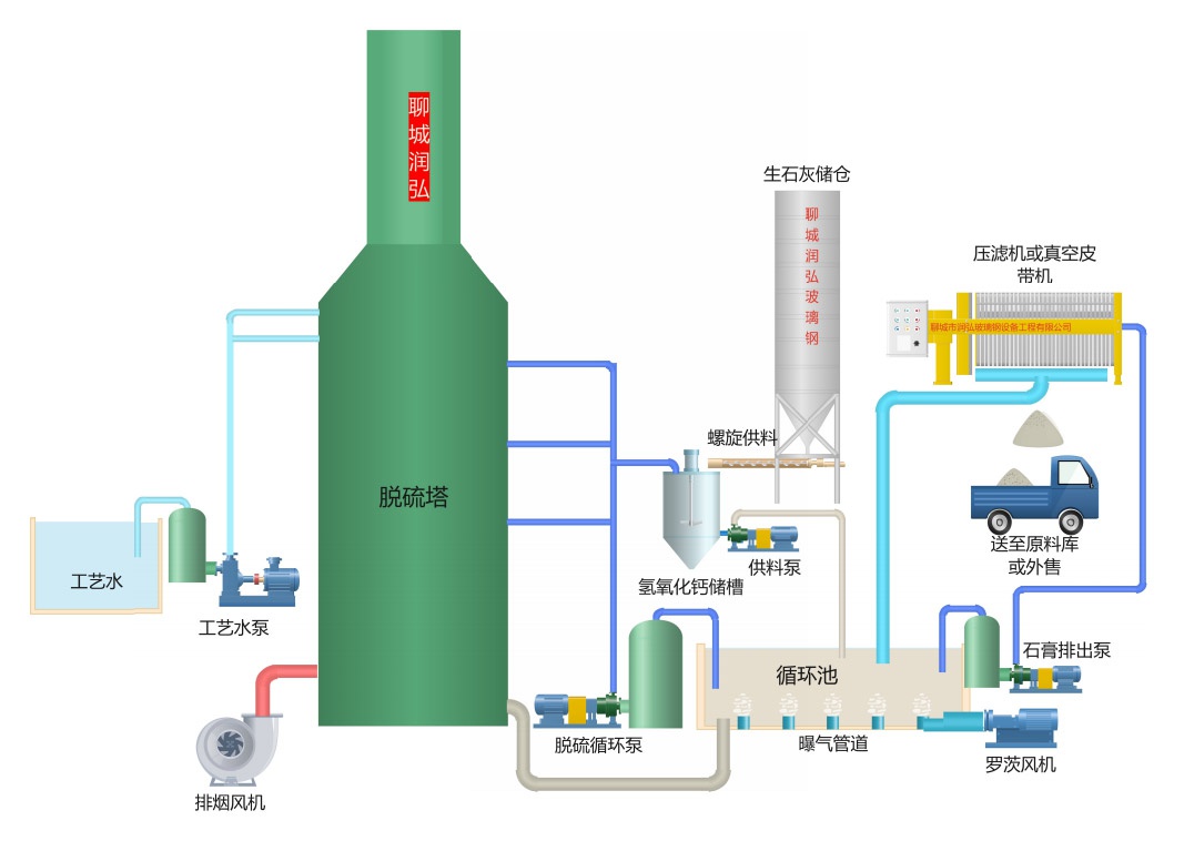 石灰—石膏脫硫工藝應(yīng)用范圍比較廣泛、工藝技術(shù)比較成熟的脫硫工藝技術(shù)。它采用價廉易得的石灰作脫硫吸收劑,粉狀石灰與水混合攪拌成吸收漿液,在吸收塔內(nèi),吸收漿液與煙氣接觸混合,煙氣中的SO2在遇到吸收液時,分解為H+和HSO3-或SO32-,與吸收液中的Ca2+反應(yīng)生成Ca(HSO3)2或CaSO3,CaSO3難溶于水,在這種化學(xué)推動力作用下,推動SO2進一步溶解,發(fā)生連鎖式反應(yīng)。生成的CaSO3再與打入水溶液內(nèi)空氣中的氧氣反應(yīng),生成穩(wěn)定的CaSO4(即石膏)。